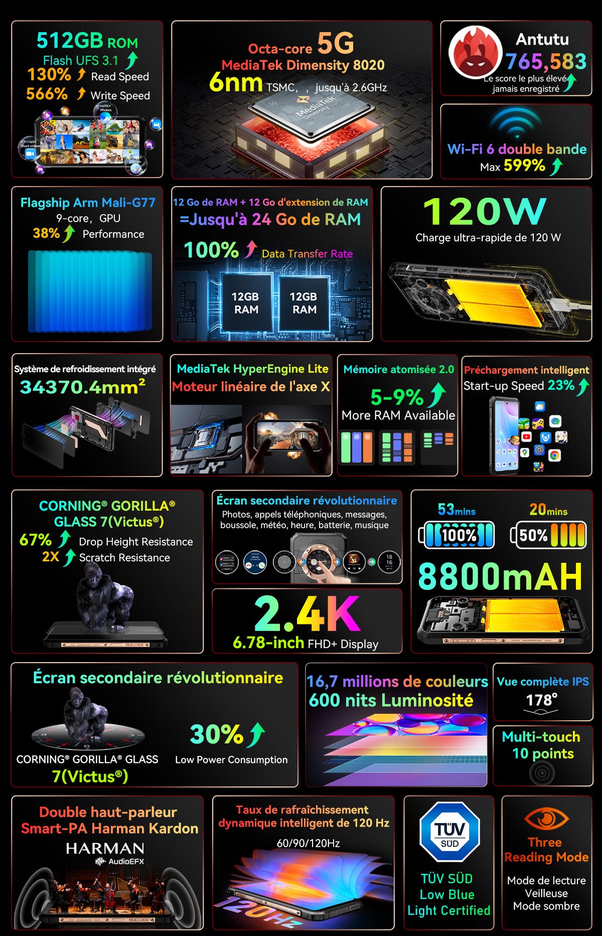 Blackview BL9000 - Écran 6,78 pouces 120 Hz 12 + 512 Go Dimensité 8020 8800 mAh 5G Smartphone robuste à double écran