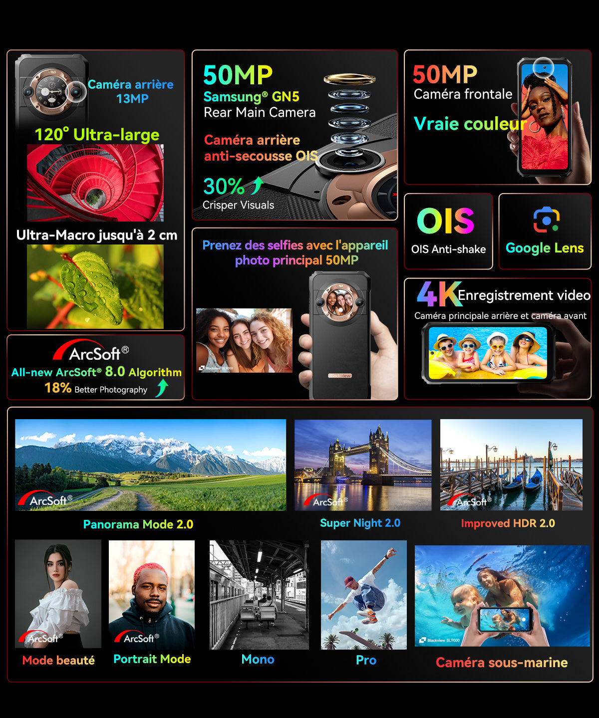Profitez de performances fluides et rapides avec le Blackview BL9000, équipé d'un processeur octa-core 6nm de TSMC pouvant atteindre 2,6 GHz, offrant une grande fluidité dans les applications quotidiennes et les jeux exigeants.